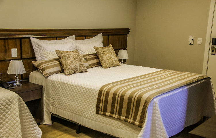 Acomodação com 24 metros quadrados, Conjunto cama box queen-size King Koil (especial para hotelaria), porta/janela ou janelas grandes, piso vinílico 100% anti-alérgico, banheiro privativo com amenities de alta qualidade e aquecimento de água a pellets ecológicos; Equipamentos: Cofre eletrônico, Frigobar 80L, Split Ar-Condicionado Inverter Quente/Frio, TV LED Full HD 42 polegadas, Claro HDTV com mais de 70 canais, inclusive canais em HD, mesa de trabalho, cadeiras, criados-mudos e abajures para leitura.